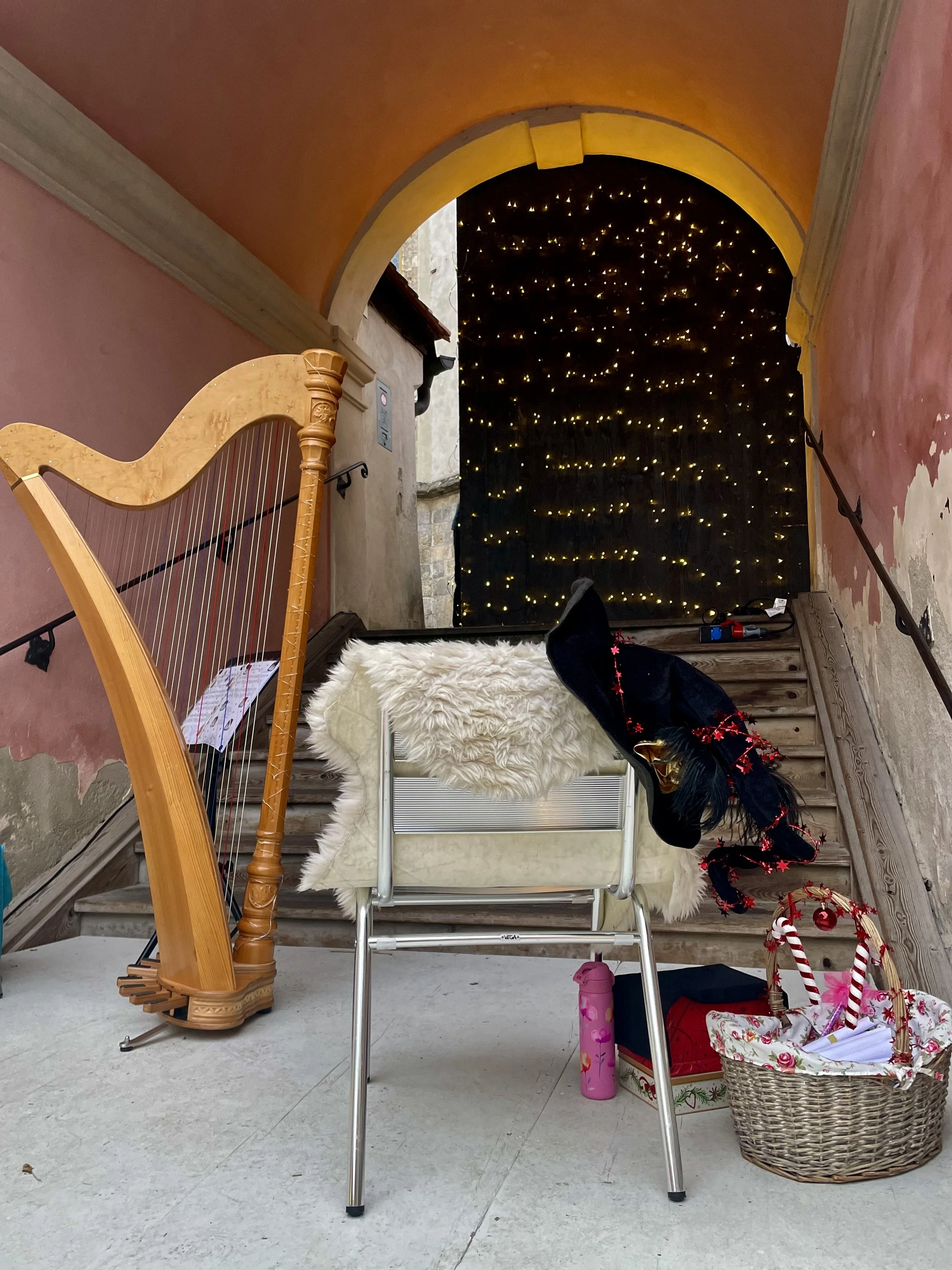 Eine adventliche Mitmach-Lesung mit Harfenmusik (Christina Anna Kasseroler, Katharina Troger) und kleinen Requisiten.