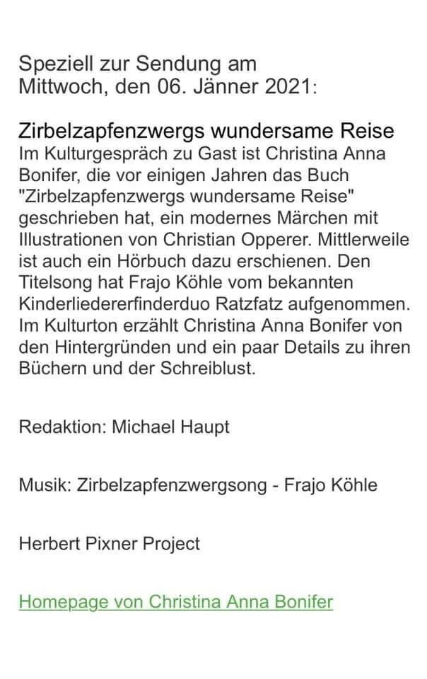 Die Autorin Christina Anna Bonifer des modernen Märchens "Zirbelzapfenzwergs wundersame Reise" ist heute Abend zu Gast im KulturTon auf FREIRAD.