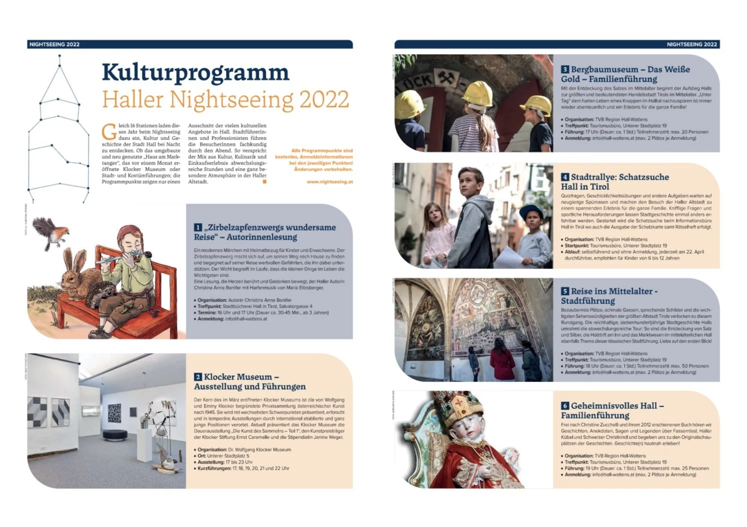 Kostenlose Führungen zu ausgewählten Sehenswürdigkeiten zeigen Kulturschätze, die in dieser Form nur an diesem Abend zugänglich sind. Am Stiftsplatz findet ein großer Nachtmarkt mit Kunsthandwerk und Selbstgemachtem statt. Zusätzlich haben Geschäfte und Gastronomielokale in der Haller Altstadt geöffnet und warten mit vielen Attraktionen, Live-Musik und Überraschungen auf.